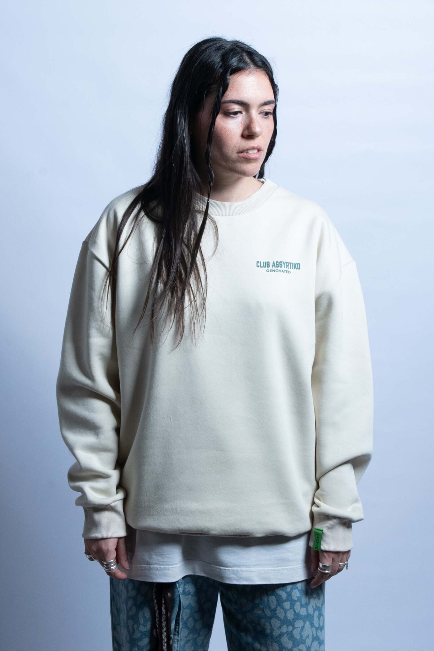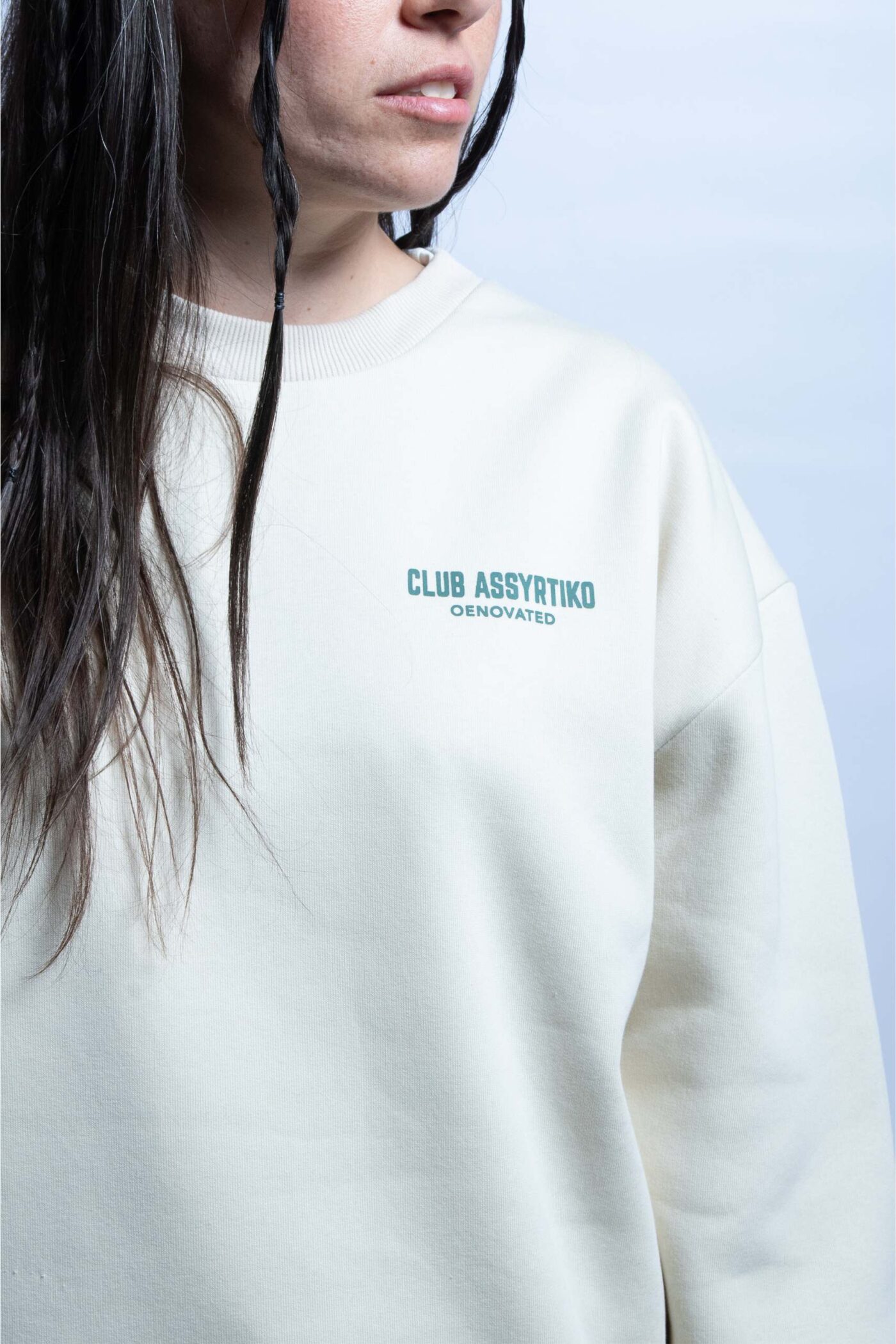 The CLUB ASSYRTIKO crewneck is made in oversized fit from heavyweight 100% cotton jersey. It also features ribbed cuffs and ribbed end. A silkscreen print logo appears on the left chest and on the back.