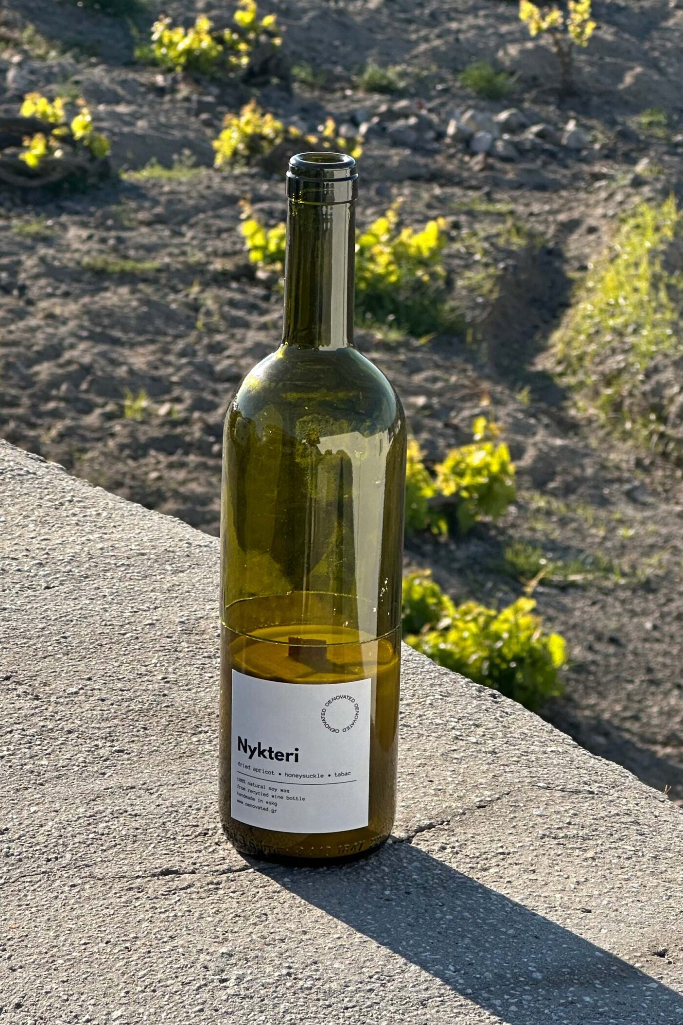 Το κερί Νυκτέρι είναι 100% χειροποίητο αλλά και φιλικό προς το περιβάλλον, φτιαγμένο από ανακυκλωμένο μπουκάλι κρασιού και 100% φυτικό κερί σόγιας.