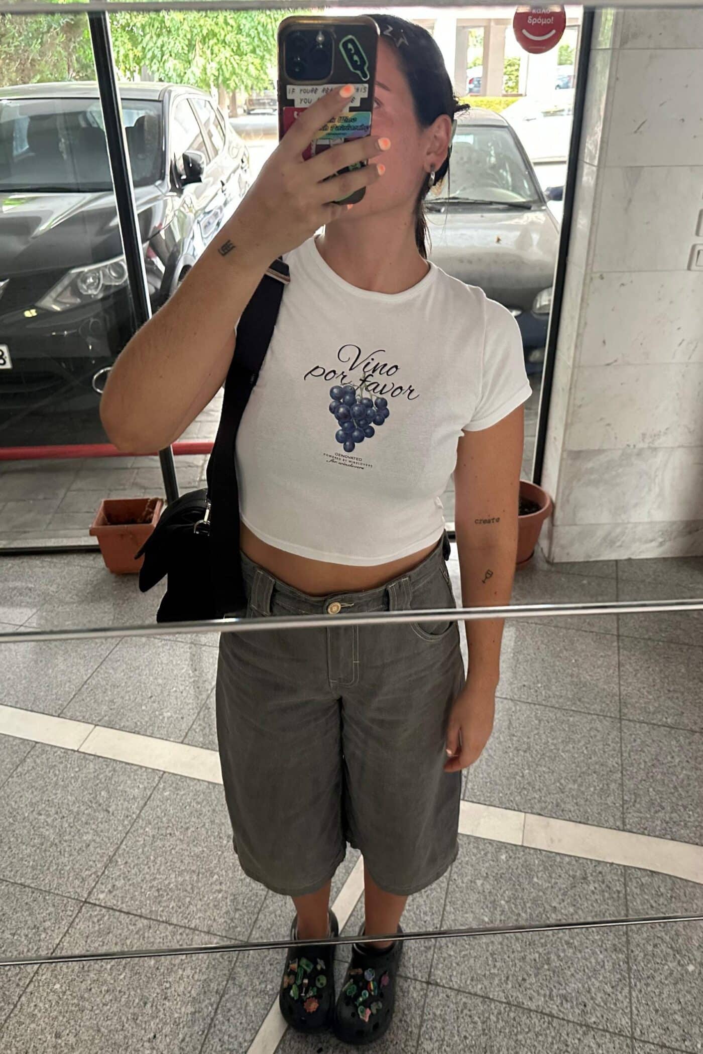 The ”Vino Por Favor” baby crop top is made in a loose fit from lightweight cotton jersey. It is detailed with a graphic print in front.