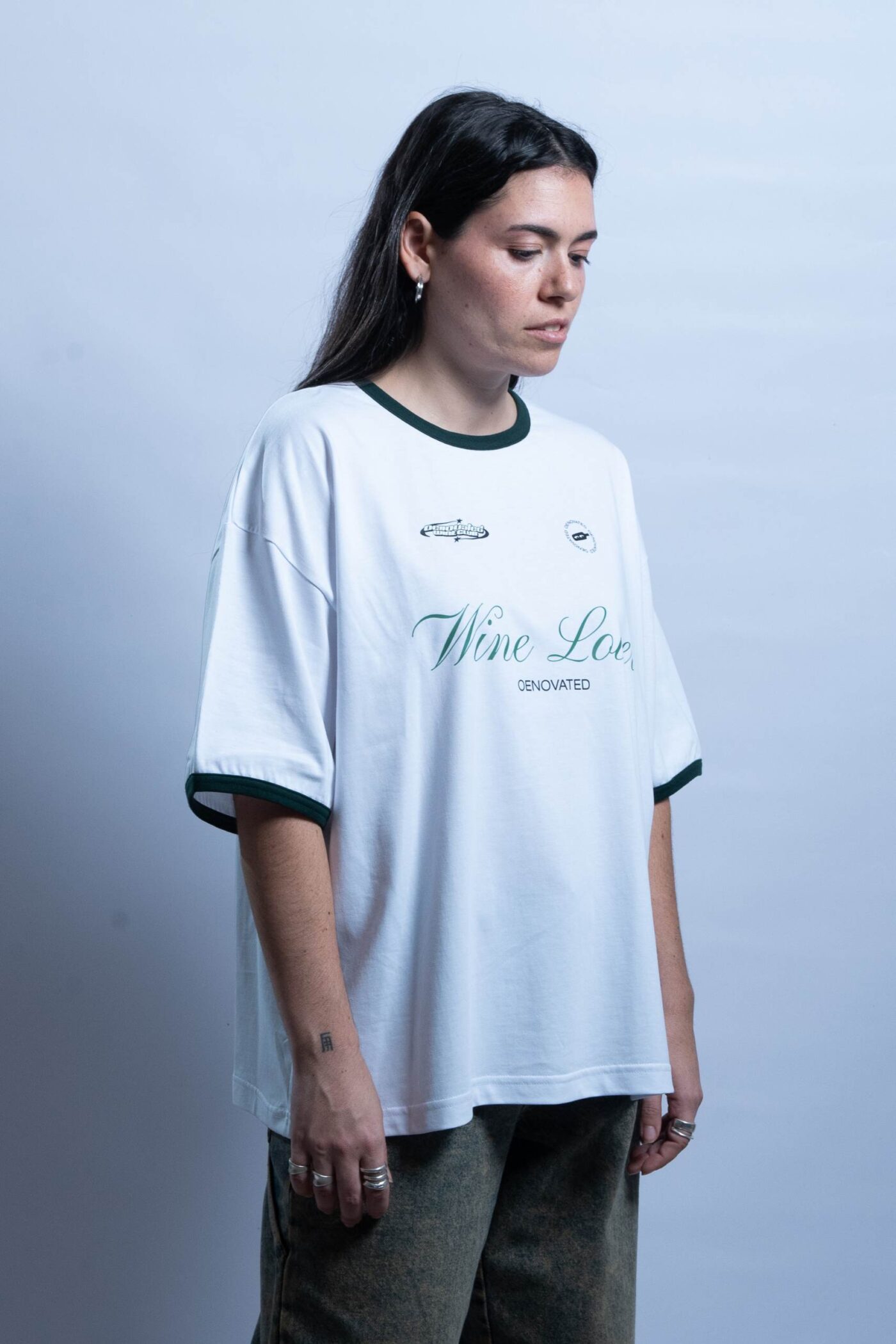 The ”Wine Lover” white boxy t-shirt is made in a loose fit from heavyweight cotton jersey. It is detailed with a graphic print in front and green details at the edges in neck and sleeves.